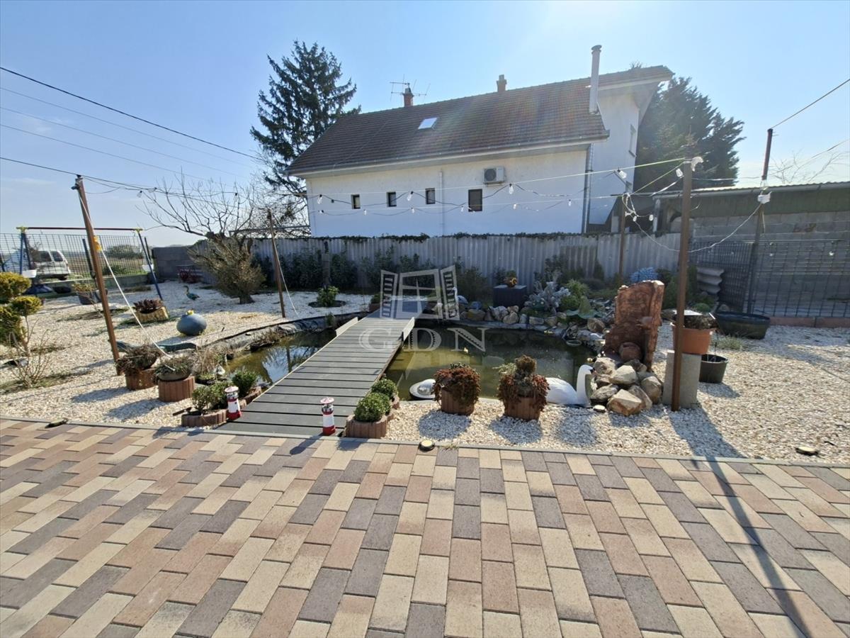 3 Garázs, kb 75 nm , kerti tó, viacolorozott kert vezet a garázshoz.