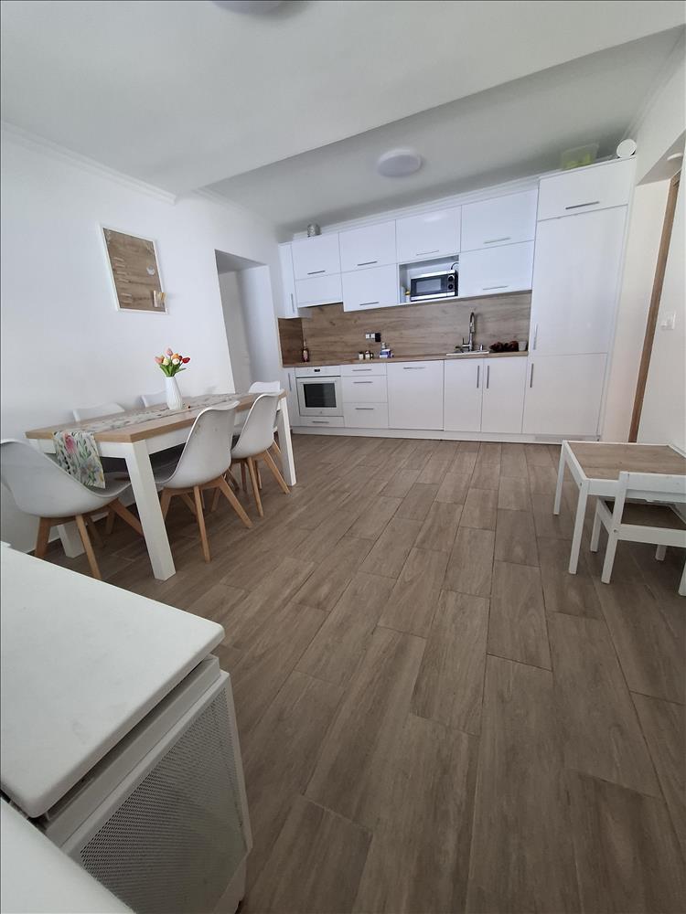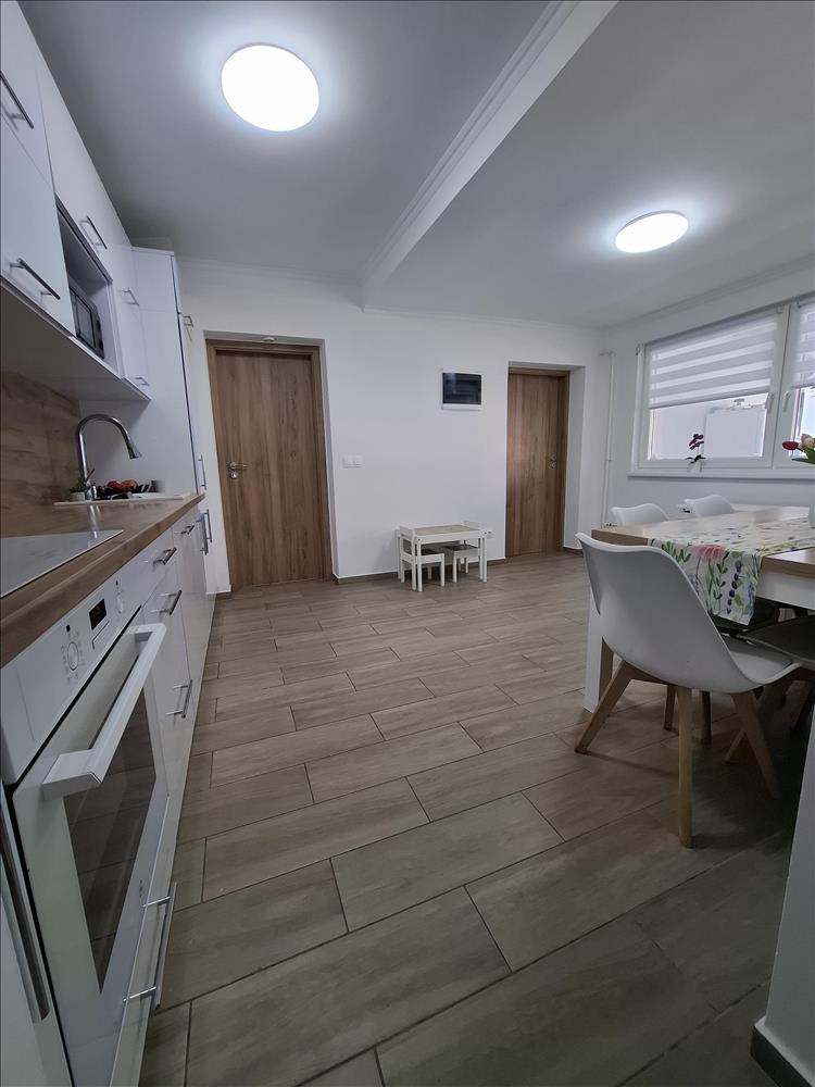• Modern, magasfényű beépített konyha gépekkel (indukciós főzőlap, sütő, mosogatógép, hűtő, elszívó – maradnak)