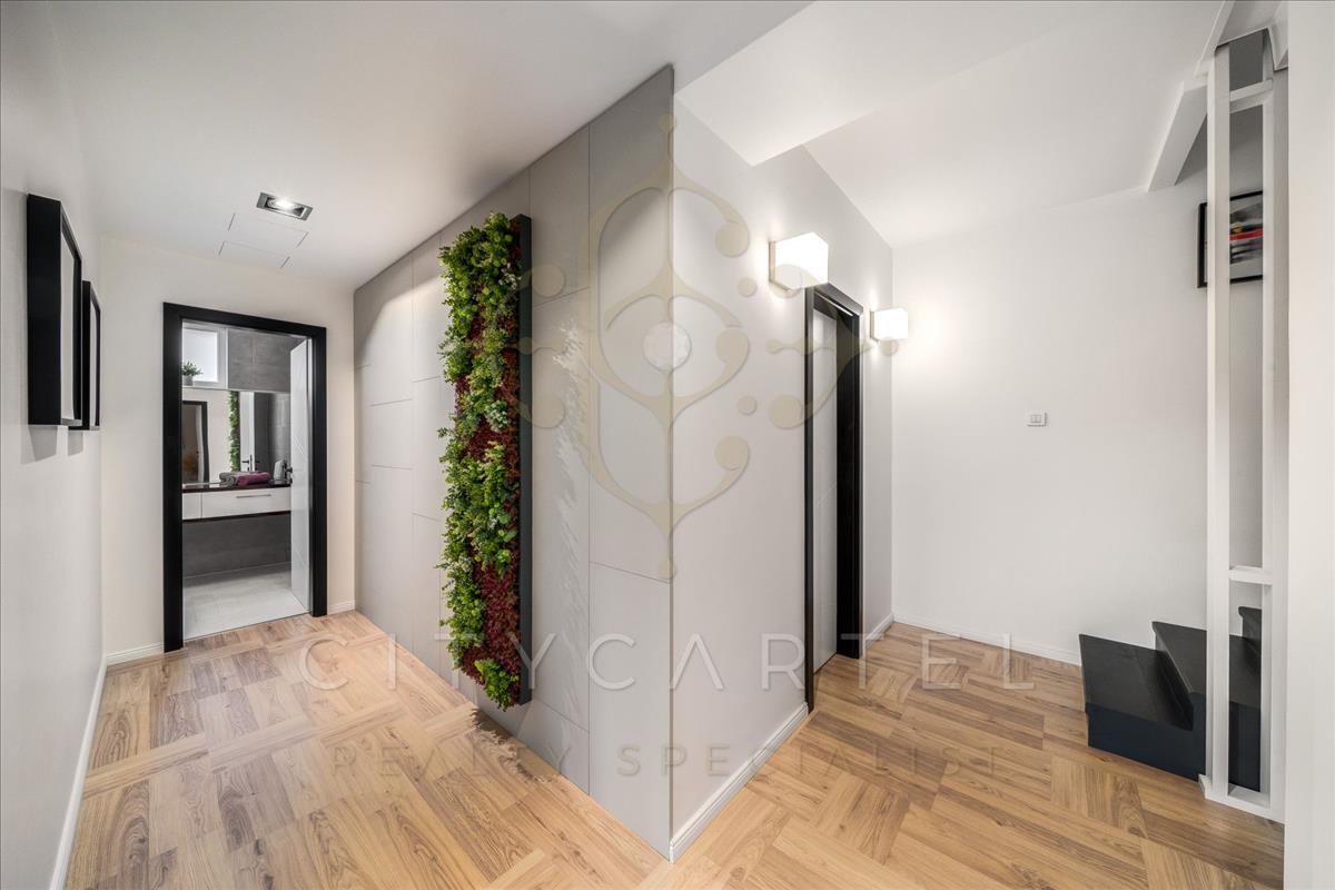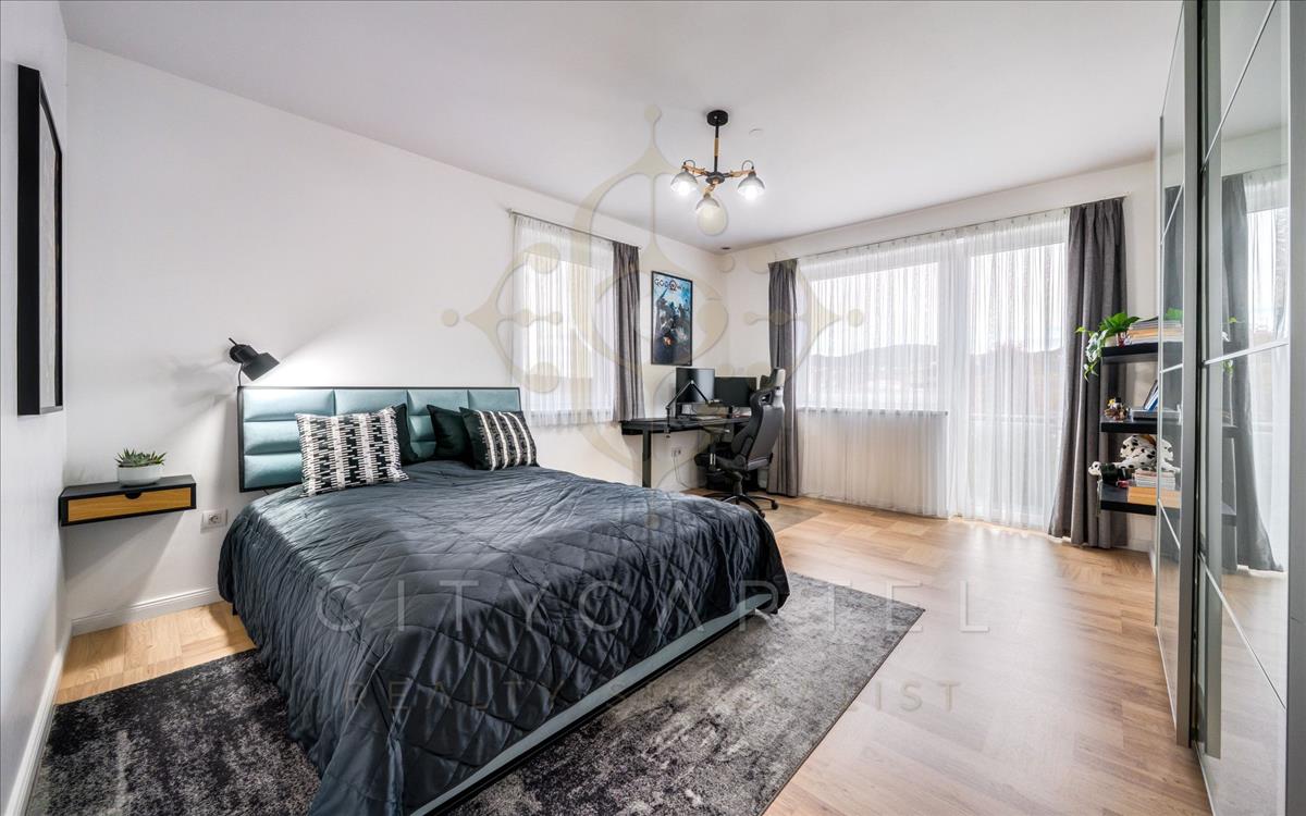 A lakótérben 4+1 szoba, 2 fürdőszoba, valamint egy nappali–étkező–konyha található, amelyek modern burkolatokkal és minőségi anyagokkal készültek.
