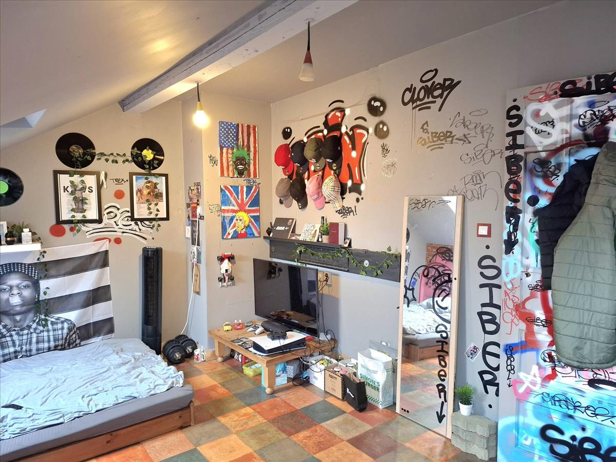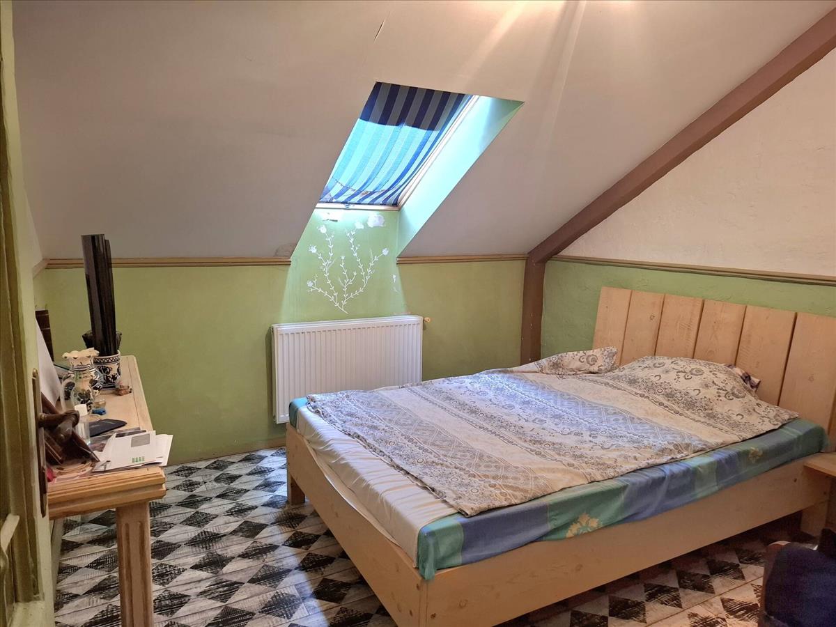 Kis szint eltolással megyünk a szobákhoz itt is. Itt a fürdőszoba zuhannyal, wc-vel felszerelt. Szép cserépkályha