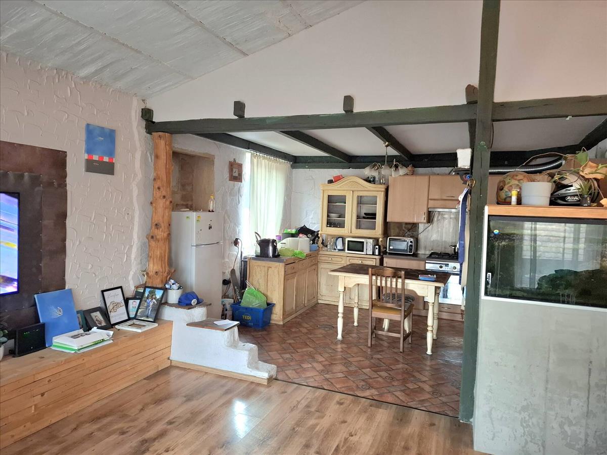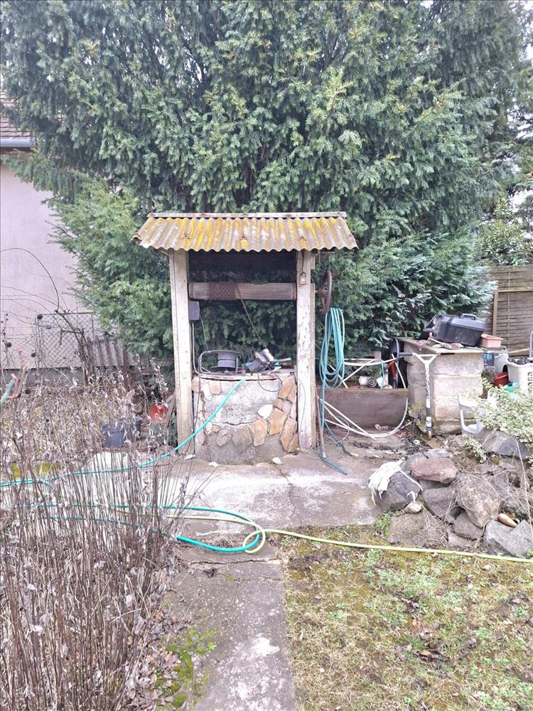 szoba, fürdőszoba. Ezt kis felújítással lakhatóvá lehet tenni. Fúrt kút adja a locsoláshoz a vizet.