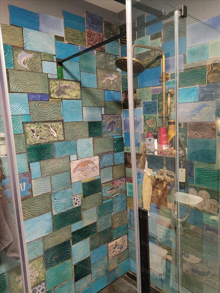a fürdőszoba zuhanykabinnal rendelkezik; gyönyörű, kézzel készült, egyedi kerámia falburkolattal és mosdókagylóval; ebben a helyiségben padlófűtés került kialakításra,