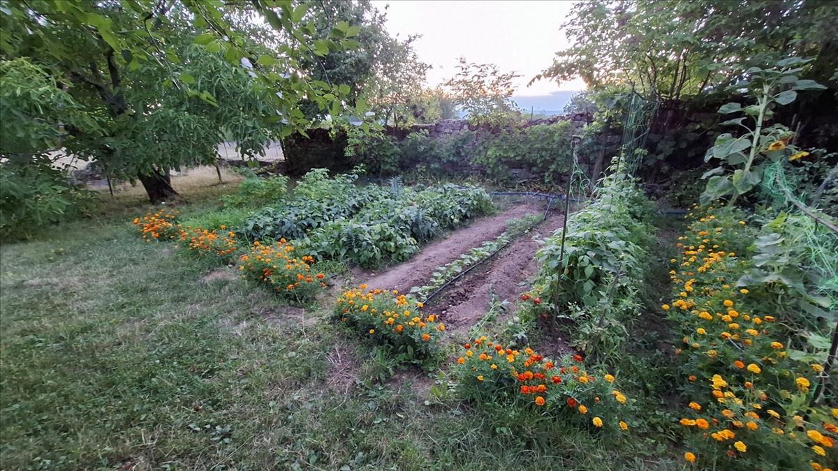 A hatalmas kert igazi kincs: cseresznye, meggy, alma, szilva, ringló, dió, füge, szőlő és mogyoró terem benne, mindez ibc tartályos esővízgyűjtővel és automata öntözőrendszerrel támogatva. Ipari áram bekötése is megtörtént.