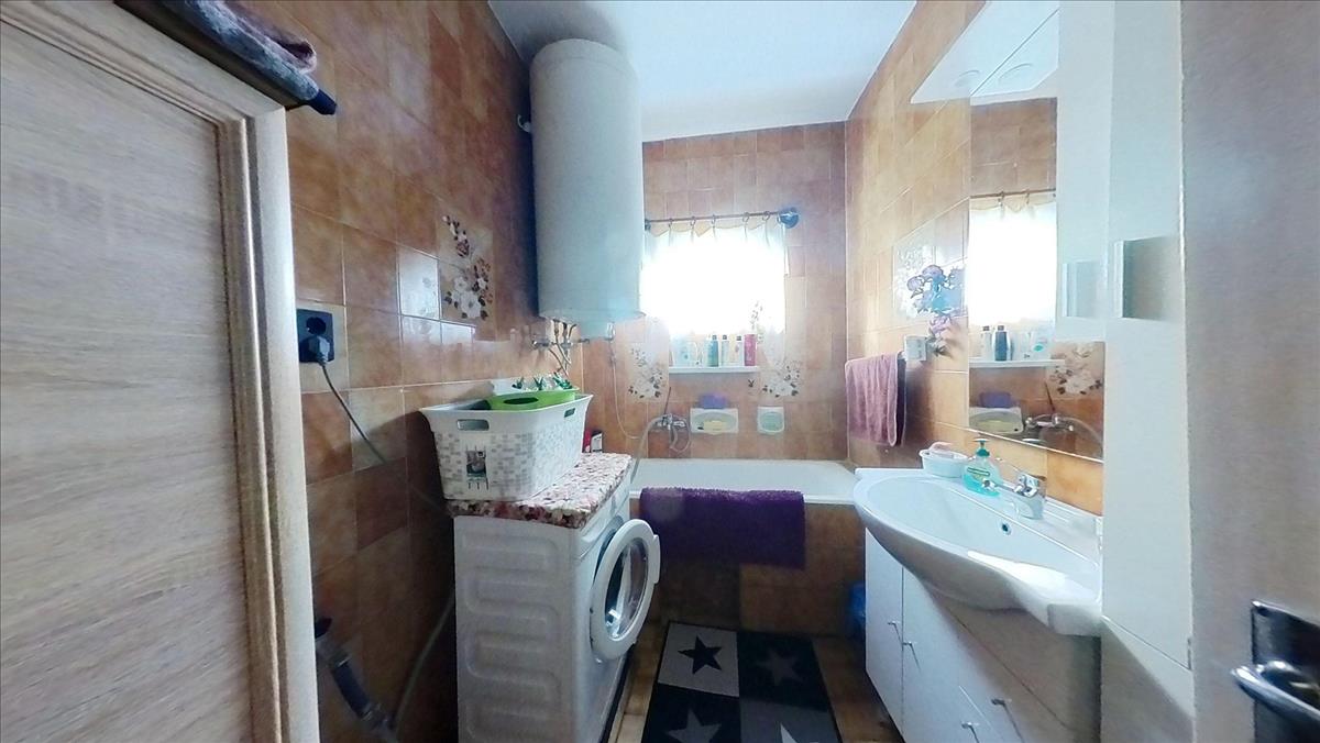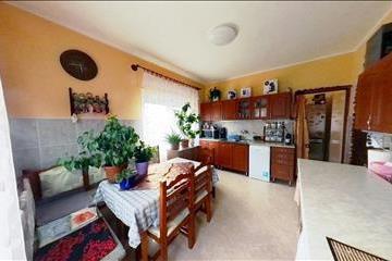 Az 1986-ban épült házban világos, kényelmesen nagy tereket találunk. Az épület 2/3 része alatt pince van, melyben egy nagy garázs, tároló helyiségek és a kazánház kapott helyet. a pince rész a föld szintjén van az enyhén lejtős udvarnak köszönhetően, így a lakótérbe pár lépcsőfok után egy fedett, méretes teraszon keresztül juthatunk be.Valóban tágas előtérbe érkezünk, ahonnan nyílnak a további helyiségek. Balra a nagy konyha-étkező van, melyet egy jókora kamra egészít ki. Jobbra a legnagyobb szoba, mely közvetlen kapcsolódik a fedett erkélyhez. a bejárattal szemben egy közlekedőbe érünk. Balra az egyik hálószoba, mellette a tetőtéri feljáró, valamint a pince lejáró található. Mellette a külön wc, tovább haladva a külön fürdőszoba van. a közlekedő végén a másik hálószobába léphetünk be.