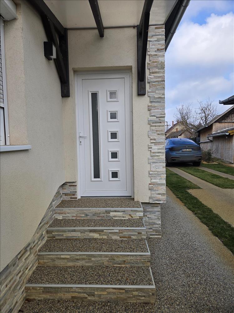 -Járdák a külső lépcsők illetve a terasz, kocsibejáró bukolása kőszőnyeggel
