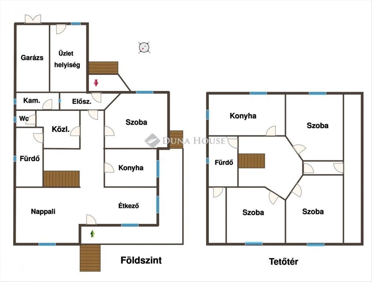 Kialakításra került a földszinten egy hálószoba, amerikai konyhás nappali, melyből közvetlen kijárás van a fedett teraszra és a kertbe. a földszinten található még előszoba, kamra, közlekedő, fürdőszoba, külön wc és egy lépcsőtér, melyen a tetőtérbe jutunk, ahol 3 hálószoba, fürdőszoba-wc, tárolók és egy konyha is található.