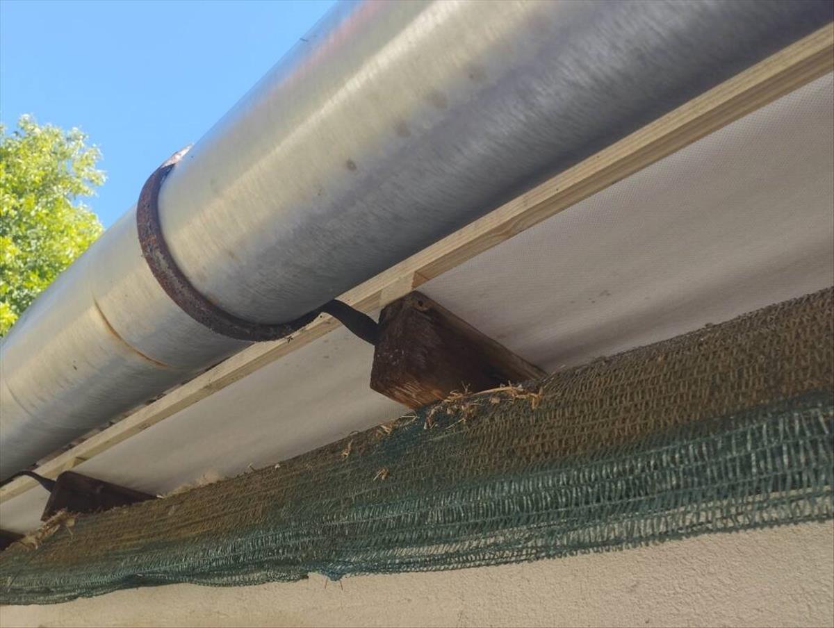 A beépített folyosó tetőszerkezetét júniusban felújították, a cserép alá vízelvezető fólia került, a korábbi beázás nyomai nem lettek kijavítva, a képeken láthatóak, ahogyan a fólia-rétegzés is.