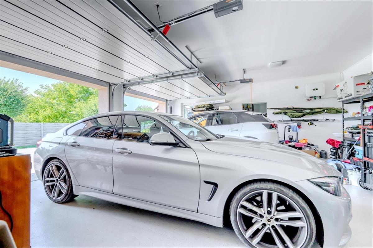 A duplagarázs két autó számára biztosít kényelmes parkolást, emellett további fedett autóbeálló is rendelkezésre áll, elektromos autó töltési lehetőséggel. a tárolók és háztartási helyiségek kiválóan szolgálják a rendszerezett otthoni működést.