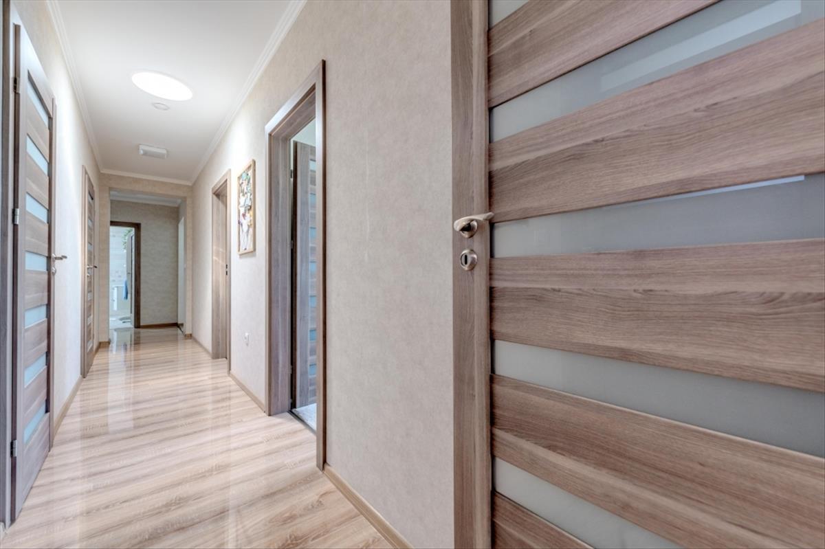 A földszinten elegáns nappaliétkező tér, három lakószoba, praktikus gardrób, valamint tolóajtóval szeparálható konyha kapott helyet, amely igény szerint egy légtérben vagy elkülönítve is használható.