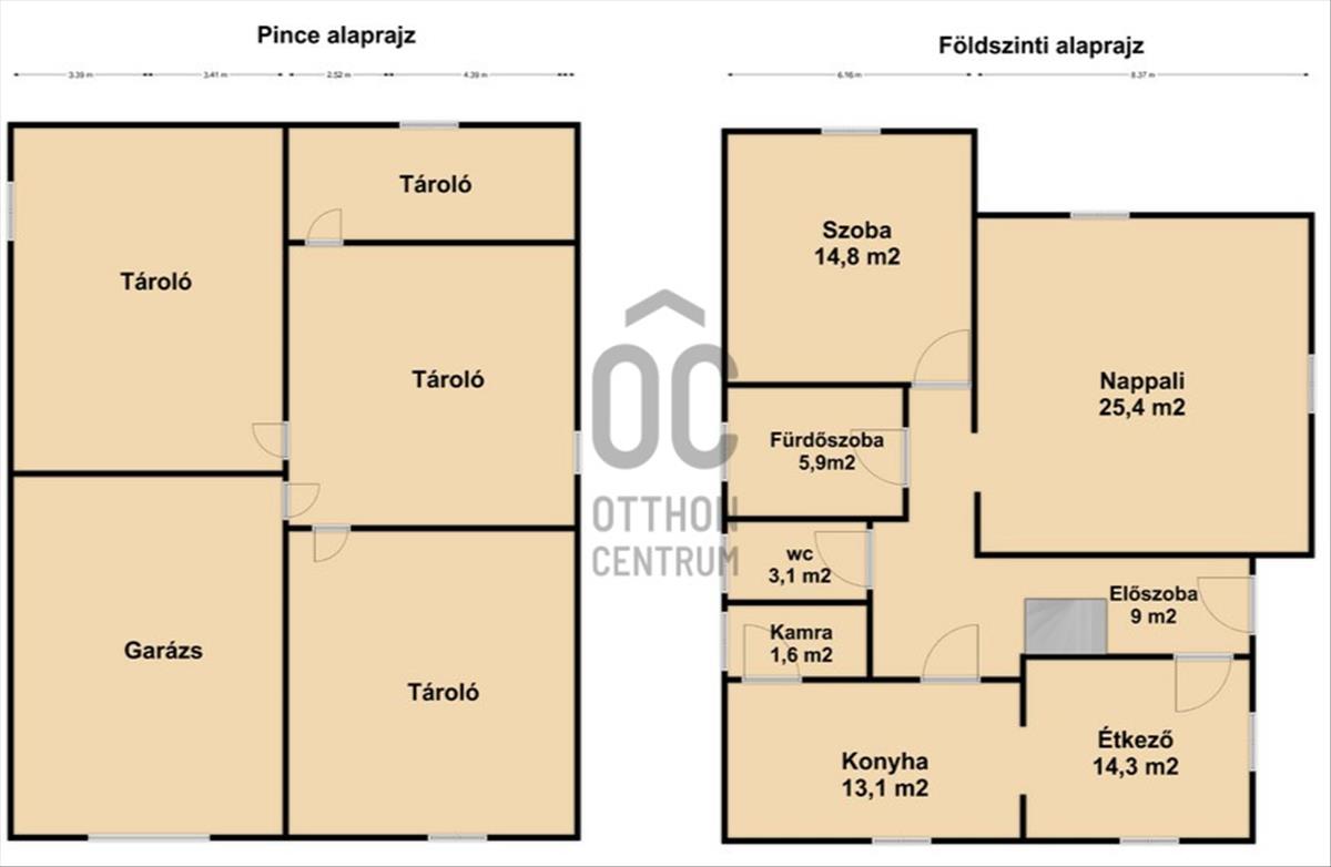 *A földszinten egy étkező, konyha, nappali, fürdőszoba, wc-kézmosó, tároló és egy szoba helyezkedik el.