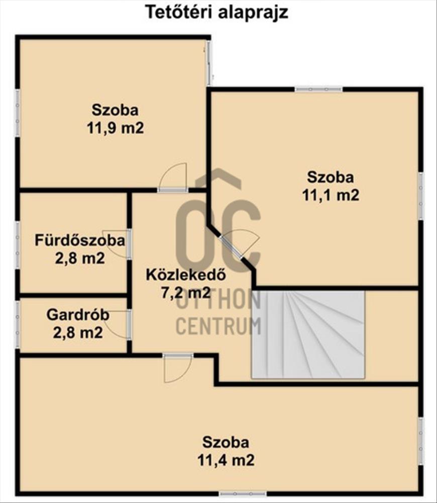 *A tetőtérben egy fürdőszoba-wc és három szoba található.