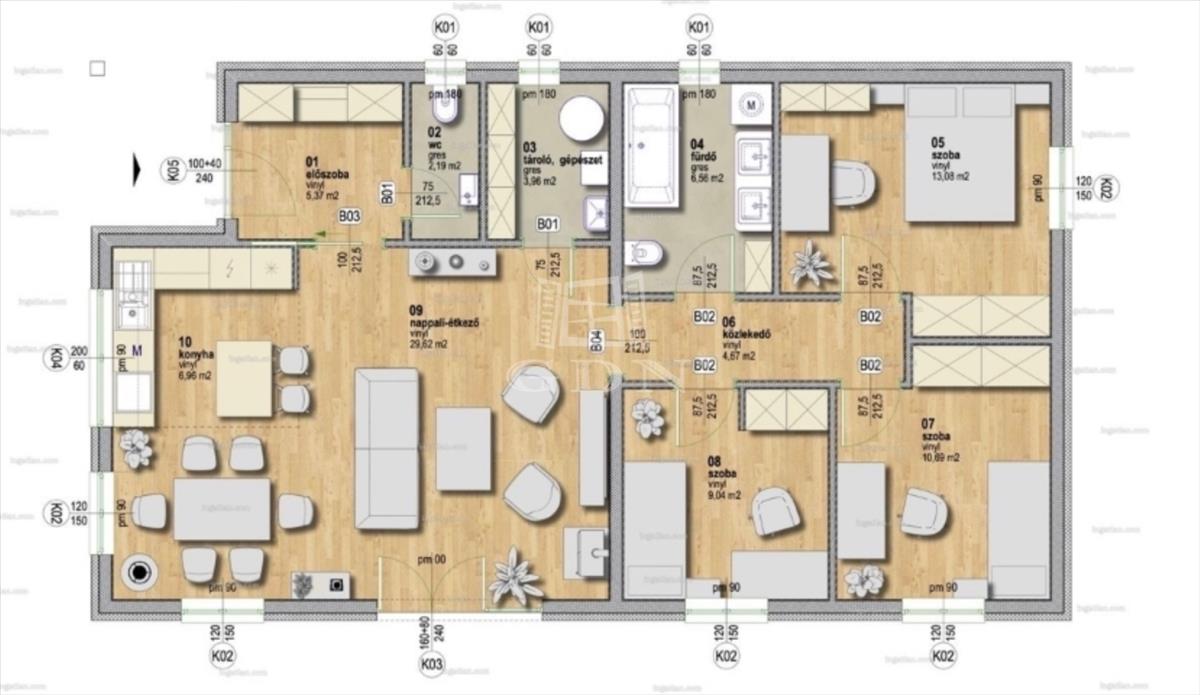 ● Nappali + 3 hálószoba + háztartási helyiség +fürdőszoba-wc-vel+ vendég wc+ terasz