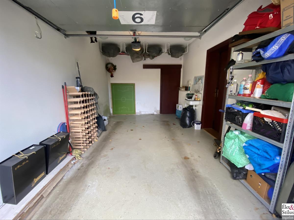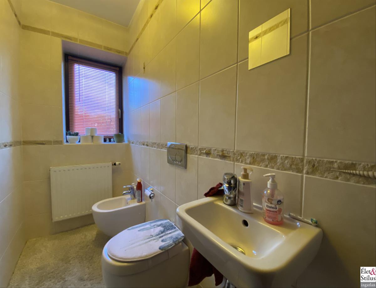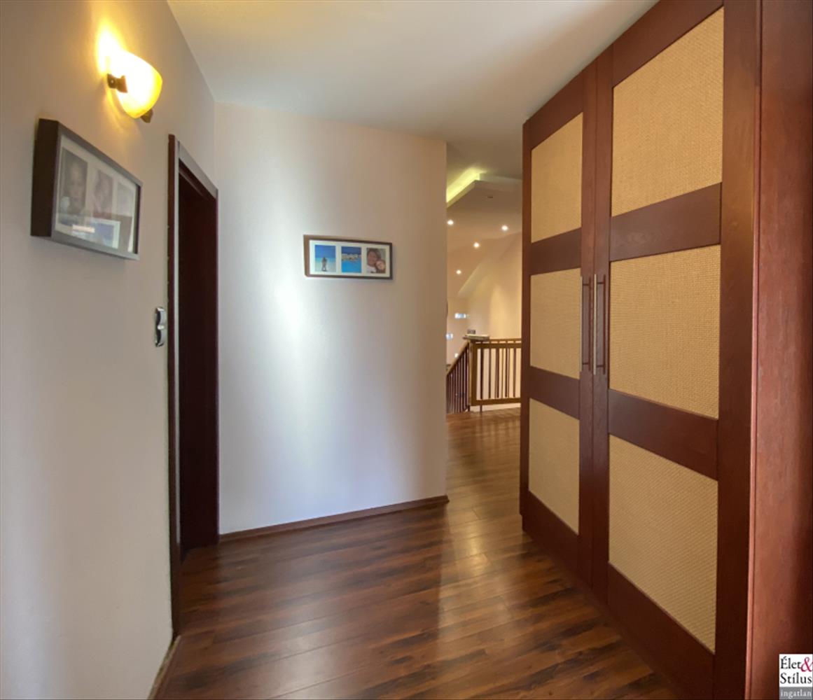 Előszobánkból, jobbra vendégszobánkba és az alsó szinten található, zuhanyzóval, toalettel felszerelt, dupla bejáratú fürdőszobánkba, balra háztartási helyiségünkbe, gardróbunkba és kazánhelyiségünkbe juthatunk, illetve 16 nm-es garázsunk is, az említett helyiségek, másik oldalán található.