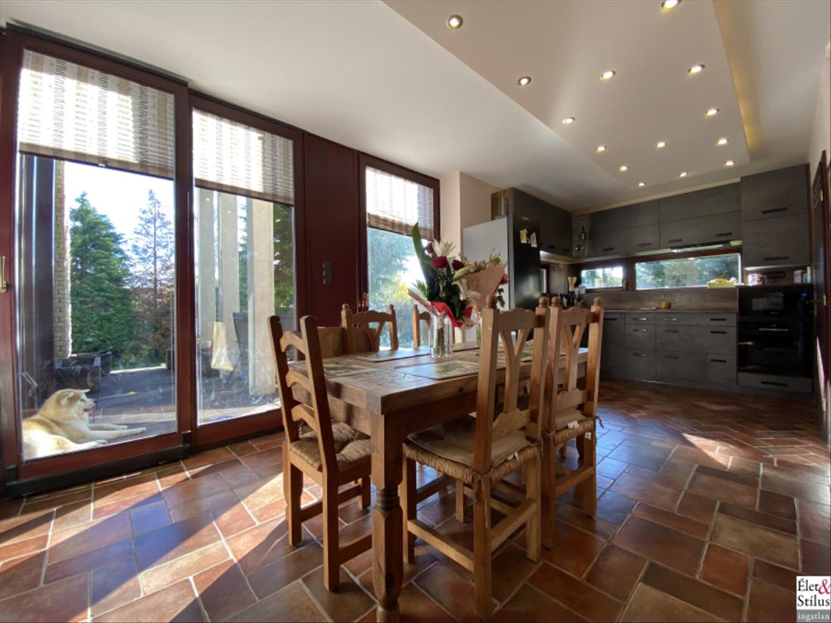 Új konyhánk, étkezőnk és óriási nappalink fényárban úszik a nagy, üvegfelületeknek, minőségi, fa nyílászáróinknak köszönhetően, ahonnan akár étkezőnkből, akár nappalinkból, tikfával borított teraszunkra is kiléphetünk.