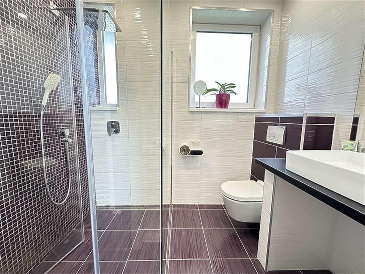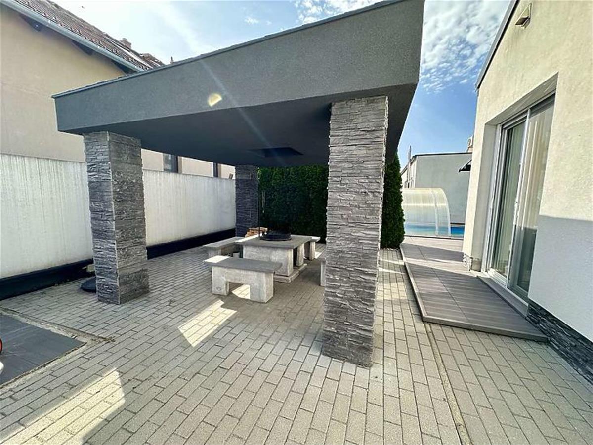 Az ingatlan kiváló elosztású: három külön nyíló hálószoba található benne, mindegyikhez saját gardrób tartozik, valamint egy tágas, amerikai konyhás nappali, amely közvetlen teraszkapcsolattal rendelkezik. a ház két fürdőszobával, két praktikus tárolóhelyiséggel, egy külön gépészeti helyiséggel, illetve egy 23, 5 négyzetméteres, padlófűtéssel ellátott garázzsal is rendelkezik. a kényelmet két nagy méretű terasz fokozza, melyek közül az egyik egy jakuzzival lett felszerelve.
