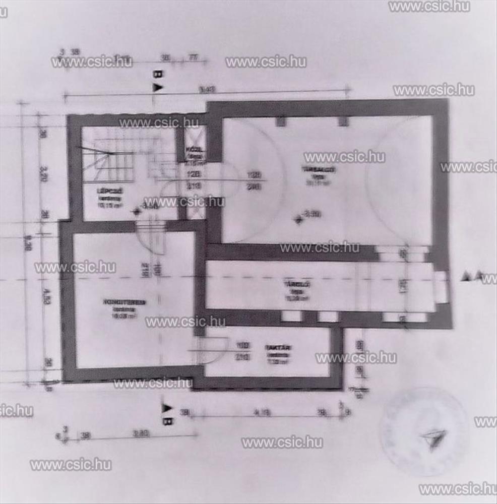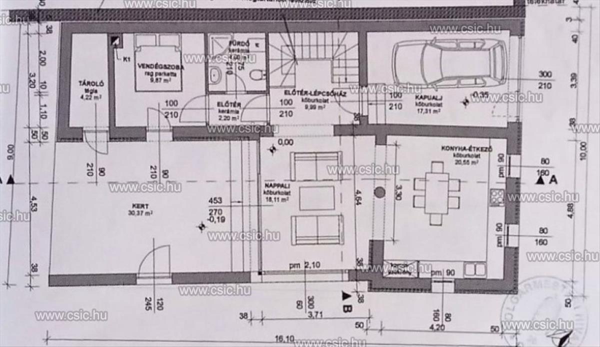 Földszint: tágas amerikai konyhás nappali (39 nm), hálószoba, tágas előtér, fürdőszoba toalettel, kapualjban garázs-tároló, gondozott kert.