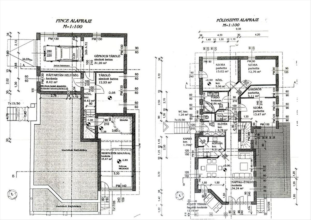 01. Pinceszint (52, 15 m2) = Háztartási helyiség + gépészet 8, 42 m2, Gépkocsi tároló 31, 2 m2, Mosókonyha + tároló 12, 53 m2