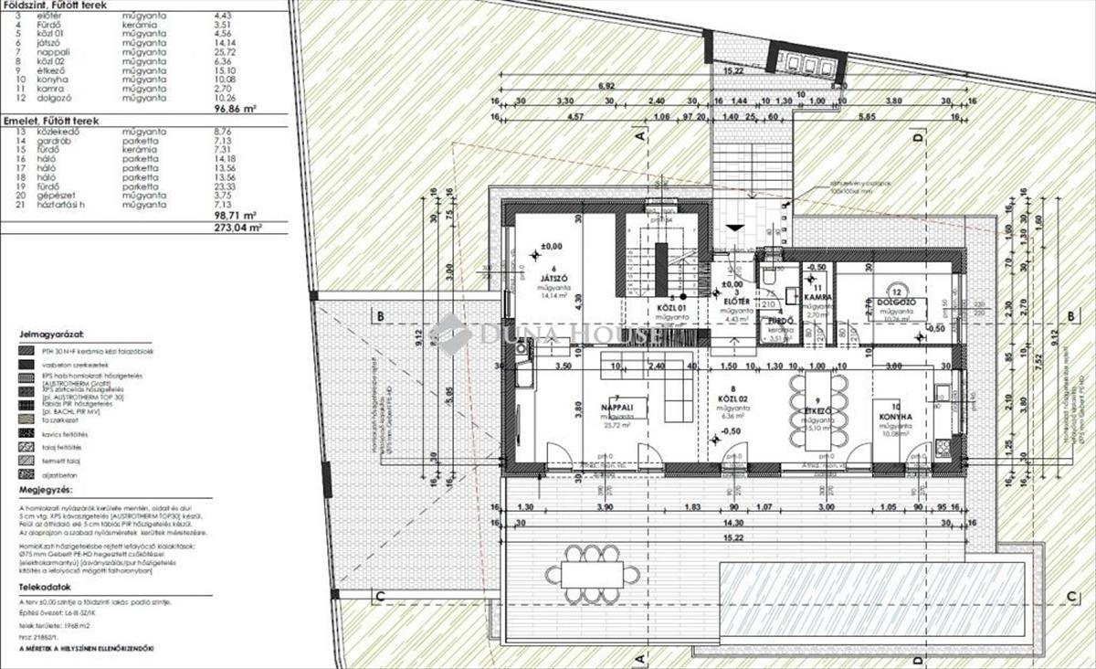 Tágas földszint: amerikai konyhás nappali, étkező, kamra, vendégfürdő, játszósarok (14 m² akár külön szoba is lehet), valamint egy dolgozószoba