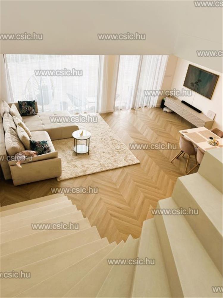 Belső 2 szintes kialakítás, dupla komfort 2 fürdőszobával, tágas penthouse jellegű terasz, panorámás erkélyek az emeleten.