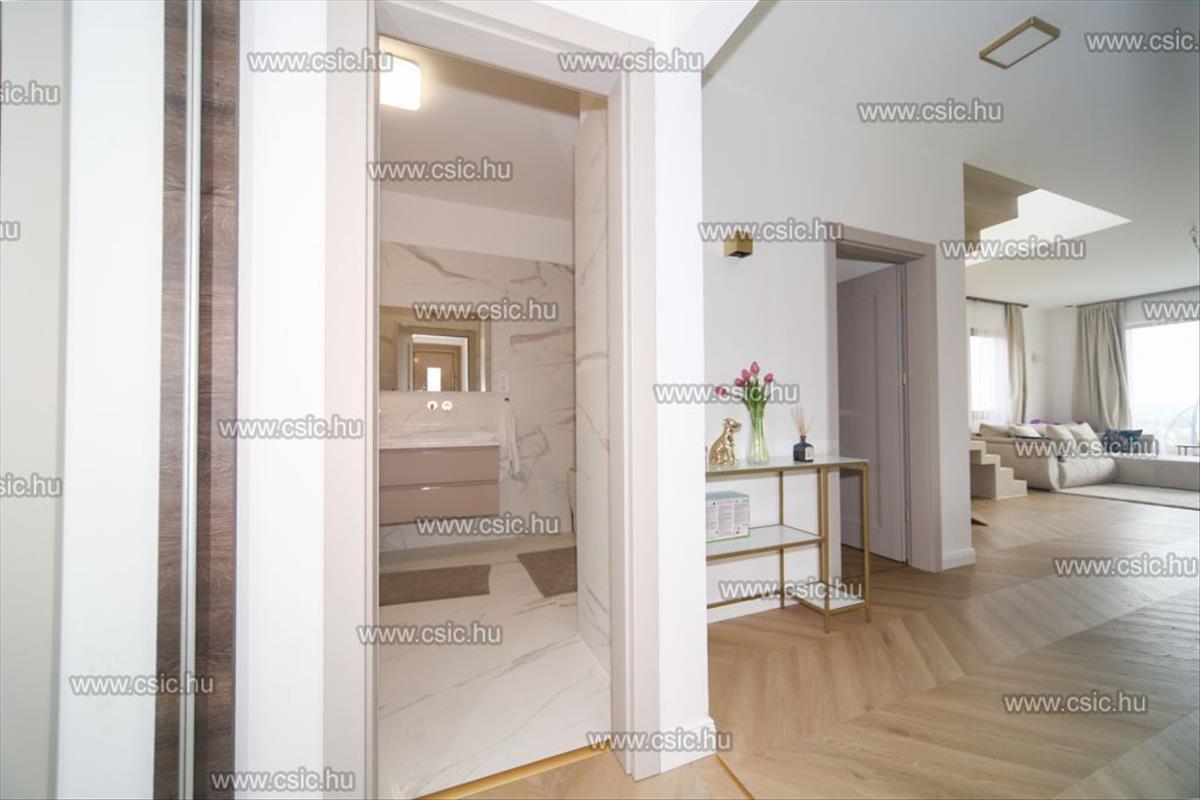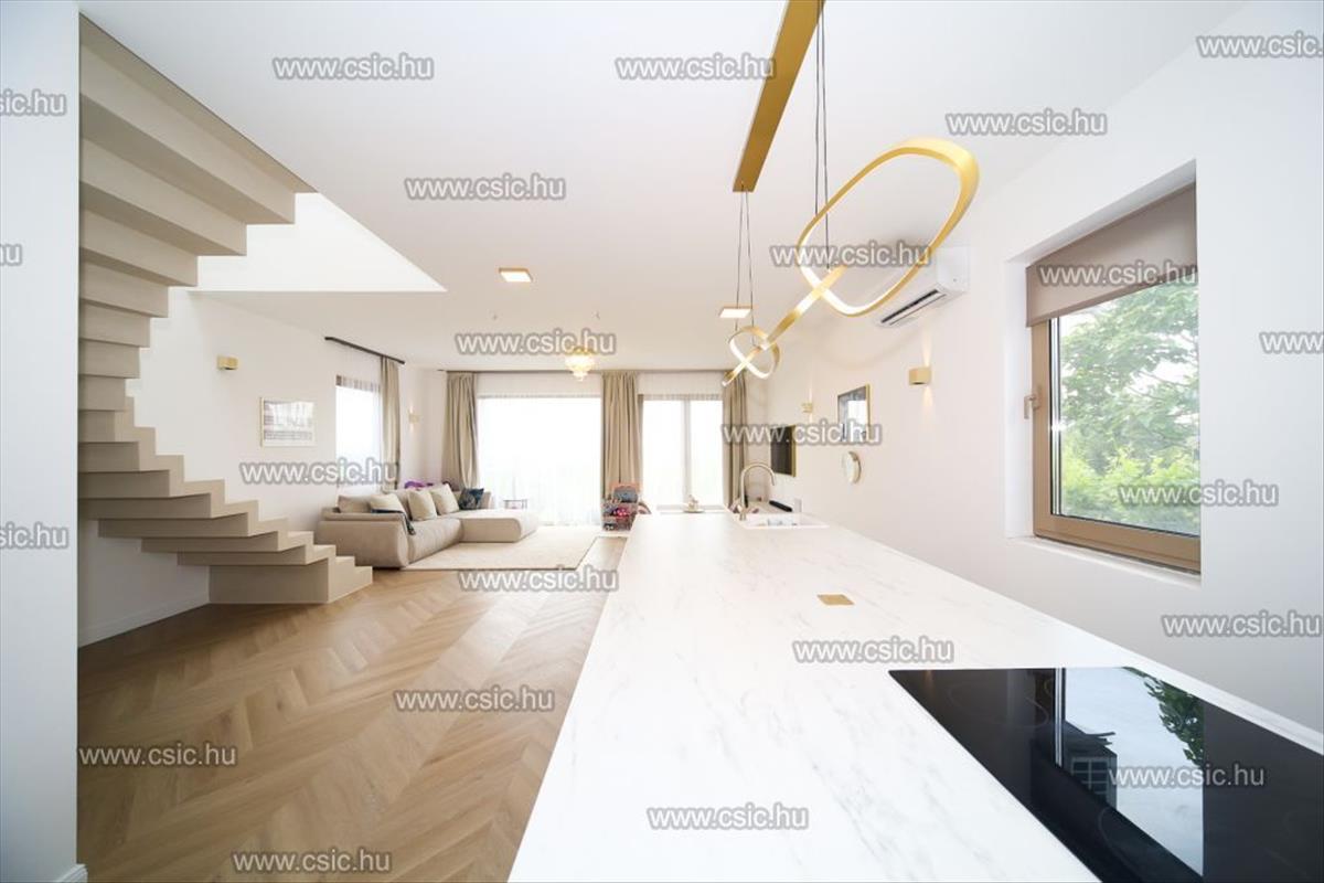Tágas nappali, egyedi tervezésű lépcső a tetőtérbe. Luxus kivitelben gépesített konyha nagy konyhaszigettel, prémium kategóriás fürdőszoba szaniterek, burkolatok, szerelvények.