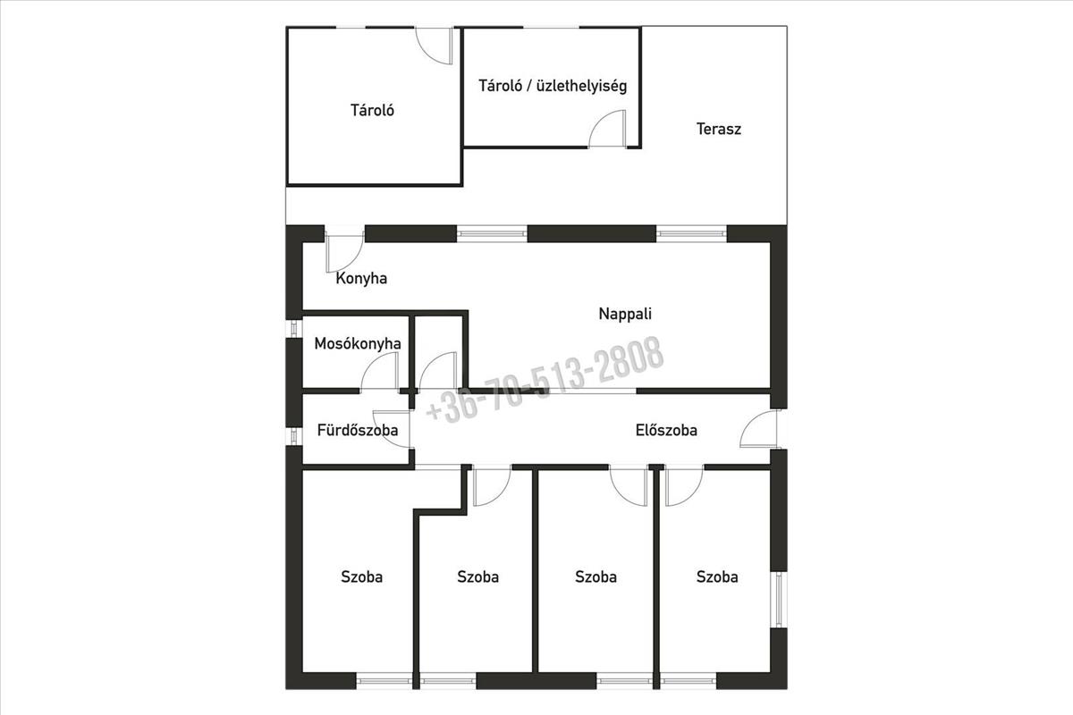 Hasznos alapterülete 92m2, melyben kialakításra került négy szoba, nappali, konyha, fürdőszoba, előszoba, mosókonyha és egy különnyíló mellékhelyiség. Remek elosztással rendelkezik, hiszen szinte minden helyiség a közlekedőből nyílik. a szobák 10-12m2-esek, két szobából lettek különválasztva, ami igény szerint visszaalakítható. a ház mögötti részen található egy fedett terasz, valamint két tároló(13+10m2), melyből az egyik akár vállalkozás üzemeltetésére is alkalmas lehet.
