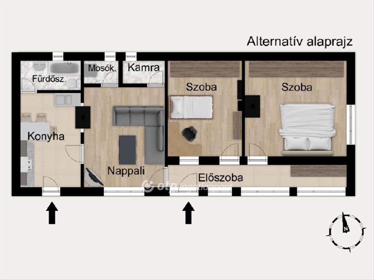 Nappali (16, 8 m2), 2 tágas szoba (20, 9 m2 és 14, 9m2) előszoba (9, 4 m2), étkező-konyha (12, 1 m2), kamra (3, 7 m2) és fürdőszoba wc-vel (3, 6 m2).