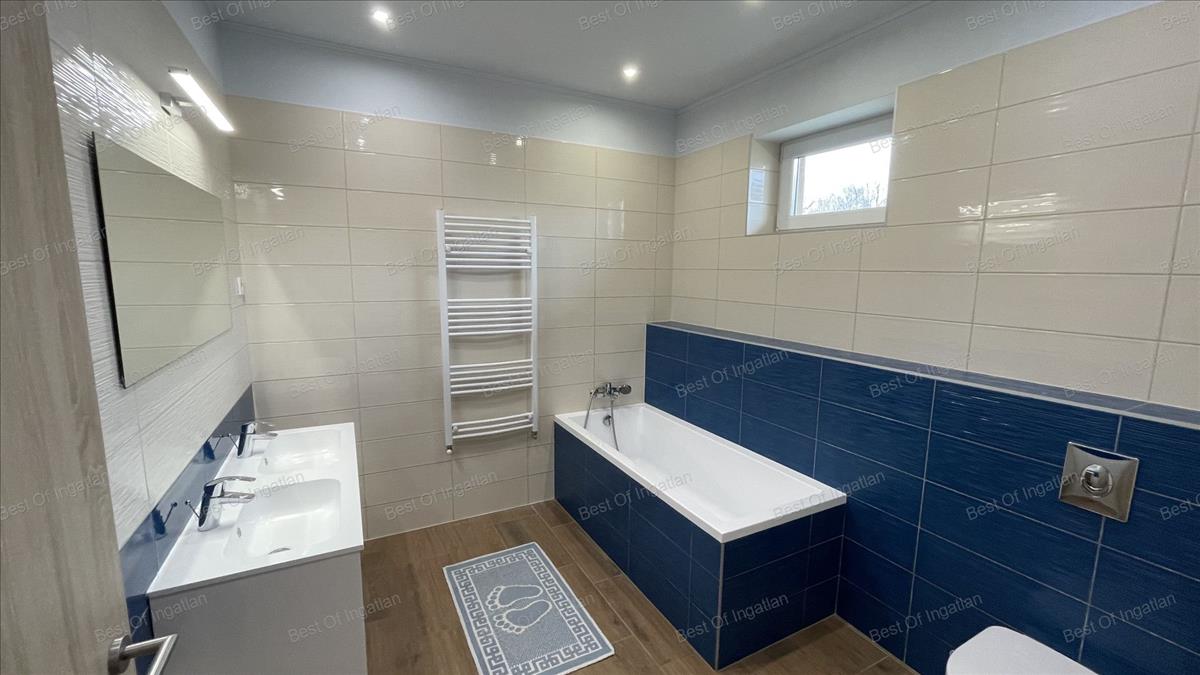előtér, vendég wc, kamra, konyha + étkező, nappali - nagy teraszkapcsolattal, 4 szoba, melyből az egyik közvetlen zuhanyzós, wc-s fürdőszobával kapcsolatos, háztartási helyiség, közlekedő, fürdőkádas fürdőszoba  wc-vel.