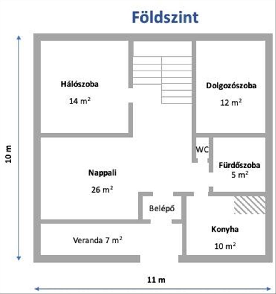 - Alsó szinten: előszoba, nappali, konyha, fürdőszoba, dolgozószoba, hálószoba