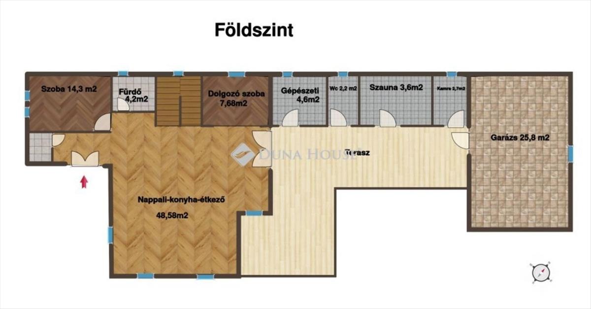 Az otthonban 4 hálószoba és egy dolgozószoba kapott helyet, valamint gardrób, kamra és külön gépészeti helyiség is szolgálja a praktikus mindennapokat.
