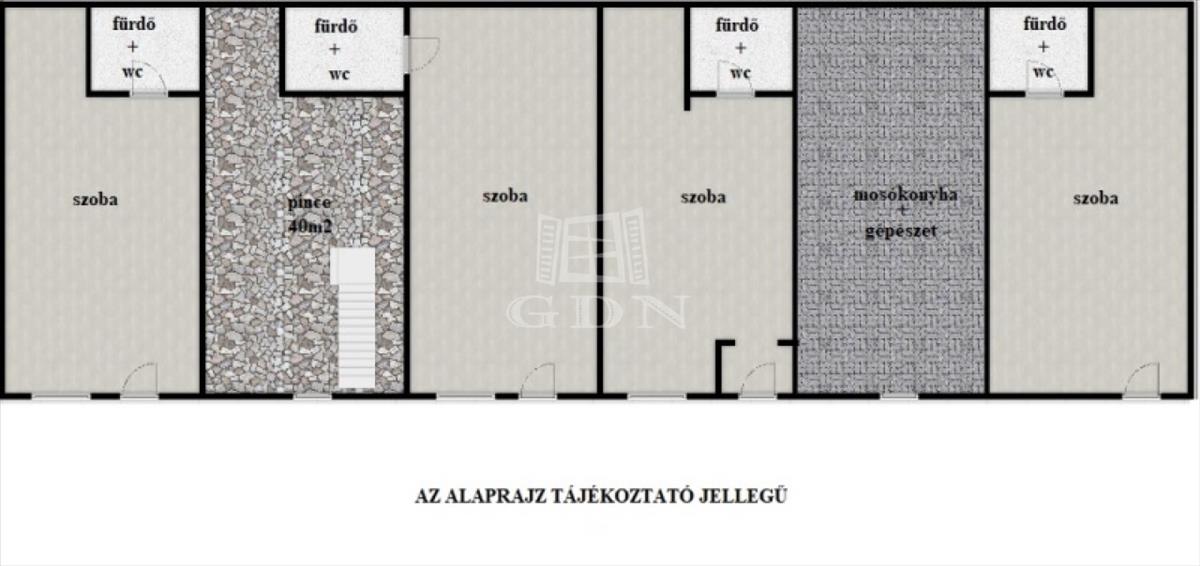 Az ingatlan két épületből áll, amelyben összesen 13 szoba, konyha+étkező, mosókonyha található. Az ingatlan további előnye, hogy 40m2 pincével is rendelkezik.