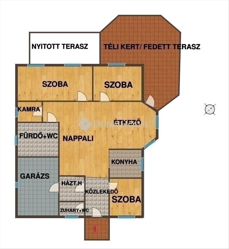 Kialakítása: 3 szoba, tágas nappal+étkező, konyha, háztartási helyiség, zuhanyzó+wc, tágas fürdőszoba és wc ahol zuhanyzó és kád is megtalálható, közlekedő, kamra, 20 m2-es garázs házon belül ki és bejárás. További 50 m2-es terasz a ház körül melynek egy része zárható, téli kertnek funkcionál.
