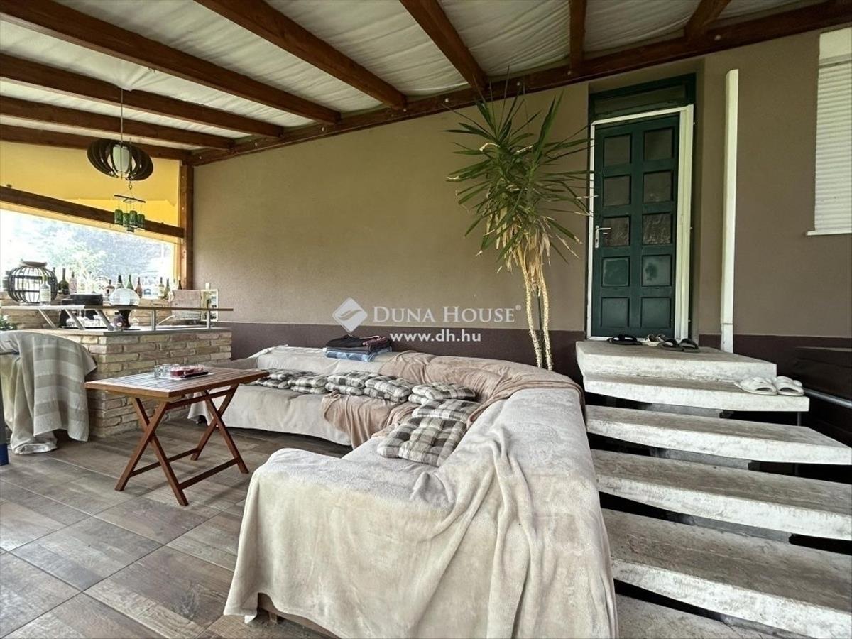 Az ingatlanból kilépve egy 76 nm es fedett teraszra lépünk mely ponyvával téliesítve van. a fedett teraszon található egy vendégváró rész bárpulttal, egy jakuzzí, és egy épített kerti sütögető, sparhelttel és zárt kemencével. Ezen felül egy nagy méretű bográcsozó hely és egy kerti szerszám tároló is van a kertben.