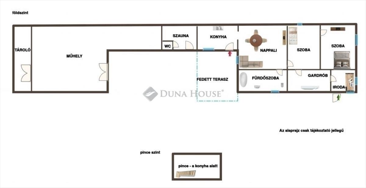 Az elrendezés praktikus és jól átgondolt: két szoba és nappali, konyha, fürdőszoba, gardrób, valamint egy külön bejárattal rendelkező iroda is helyet kapott, továbbá pince is tartozik az ingatlanhoz.