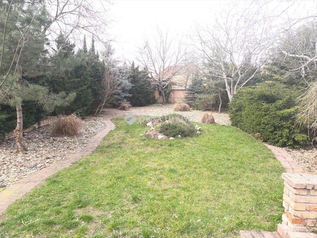A házhoz tartozó 1678m2-es telekterület szépen rendezett. Az autóbeálláshoz, járdaként, illetve kinti időtöltéshez adott területek jó minőségű térkővel fedettek, emellett zöldterület, épített kert, sziklakert is megtalálható a kifejezetten tágas területen. Parkoláshoz 2 darab, 2 állásos garázs áll erndelkezésre, melyek természetesen távirányítható, elektromos kapuval nyithatóak, akárcsak a telekre bejáratot biztosító kapu. Mindkét garázsban elektromos autótöltéshez is rendelkezésre áll kiállás. Térkövezett területen ezen felül is megoldott további autók parkolása. Tároláshoz egy további tágas tárolóhelyyiség, és egy borospince jellegű, boltíves, száraz pince is rendelkezésre áll (nem a ház alatt található).