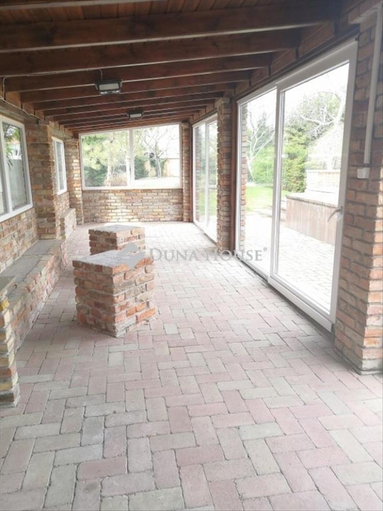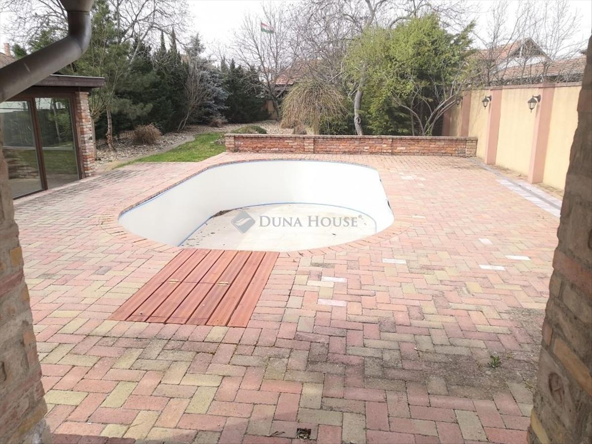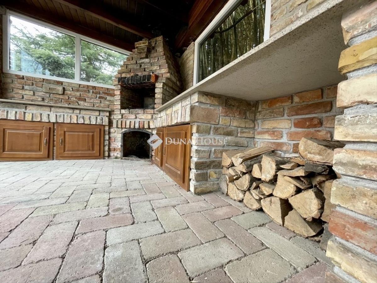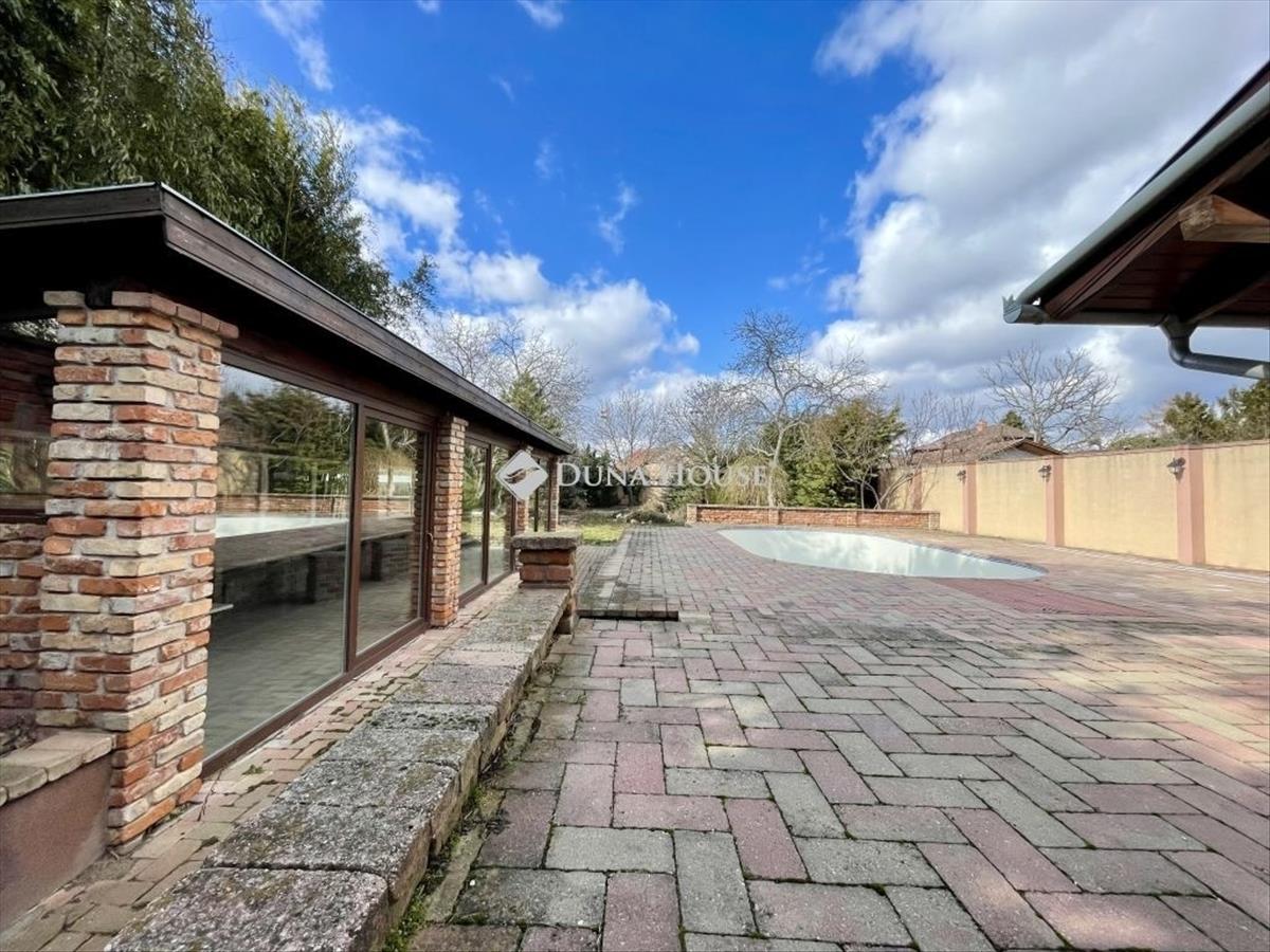 A kinti időtöltés középpontja a ház mögött, belátástól mentes területen megépült, úszáshoz is elegendő méretű medence, melyhez egy az irányában teljes üvegfallal rendelkező kerti pavilon csatlakozik, ahol épített sütögető is megtalálható, akár nagyobb léptékű családi, baráti rendezvények megtartására is ideális.