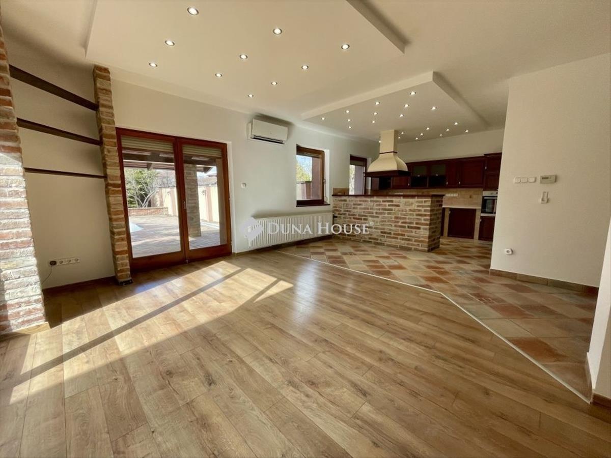 Az ingatlan földszint + beépített tetőtér kilakítással rendelkezik. Alsó szintjén egy tágas (közel 40m2-es) amerikai konyhás, teraszkapcsolatos nappaliszoba, 3 különnyíló hálószoba, egy fürdőszoba+wc, egy külön wc, egy háztartási helyiség, egy előszoba, közlekedő továbbá tároláshoz praktikusan egy tágas kamra, egy gardrób, és egy kisebb tárolóhelyiség kaptak helyet. a felső szinten egy nettó 30m2-es, egy légterű, tetőtéri szoba található. Az ingatlan minden helyisége kifejezetten jó fényviszonyú, a jól átgondolt elrendezésnek köszönhetően kiválóan berendezhető. a lakótérből a nappali irányában kilépve egy 36m2-es, fedett teraszra érkezünk, mely kialakításában kapcsolódik a medencéhez, és a sütögetéshez is ideális kerti pavilonhoz.