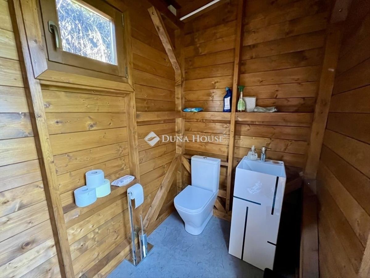 35 m²-es kerti faház tárolóval, WC-vel és mosdóval