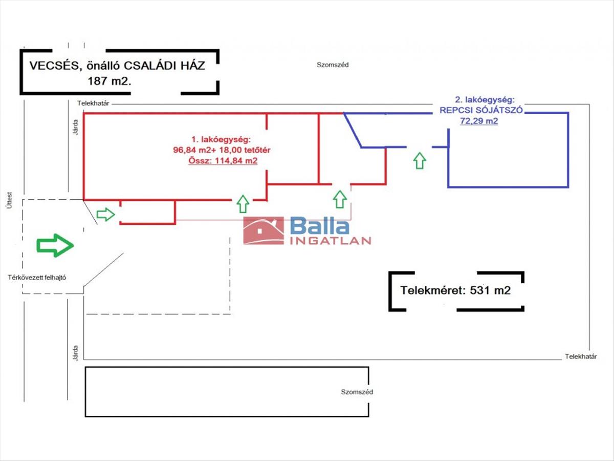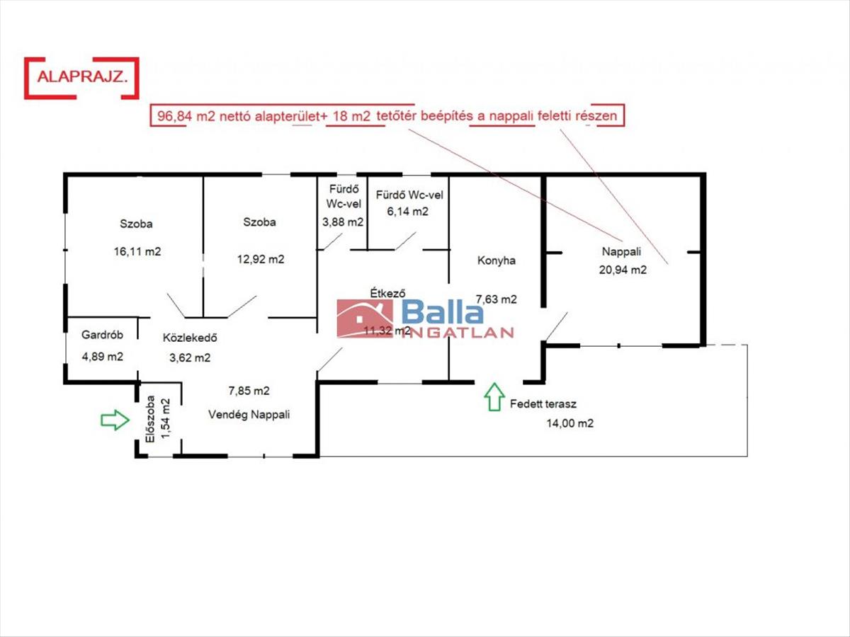 1. Számú. Lakóegység(főépület): 96, 84 m2. Nettó. + 18 m2 tetőtéri ráépítés. Összesen: 114, 84 m2. Nettó.