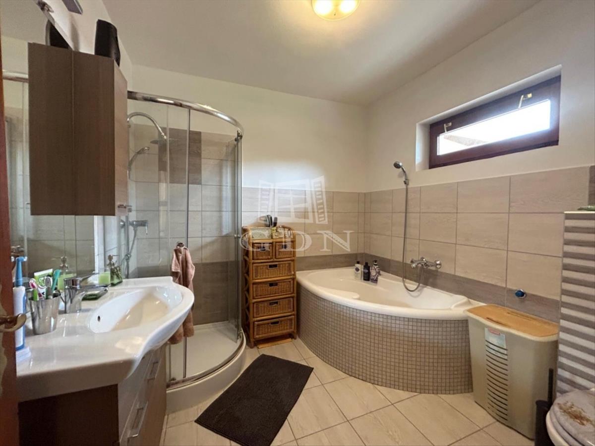A nettó 90 m2 lakóterületű, 40 m2-es nappali - étkezővel rendelkező, két hálószobás, gázcirkó fűtéssel és 6, 5 kW-os + 3, 5 kW-os klímákkal, illetve fűtőpanelekkel is fűthető, földszintes, beton födémes, lemezcserép fedéses, 30-as tégla falazattal, 30 cm-es kőzetgyapot födém szigeteléssel, fa szerkezetű dupla üvegezésű nyílászárókkal rendelkező családi házhoz 21 m2-es fedett terasz, 16 m2-es pince és 17, 3 m2-es, egyállásos garázs kapcsolódik.