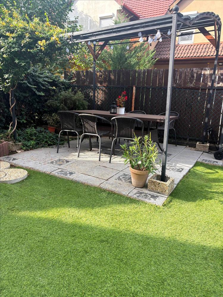 részben műfűvel burkolt de ültetett szép nővények is vetnek árnyékot, kövezett rész szaletlinek kialakítva