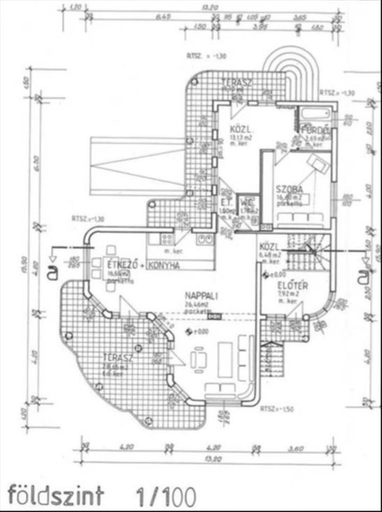 két részből álló nappali, hatalmas konyha, fürdőszoba ( zuhanyzó wc ), két terasz