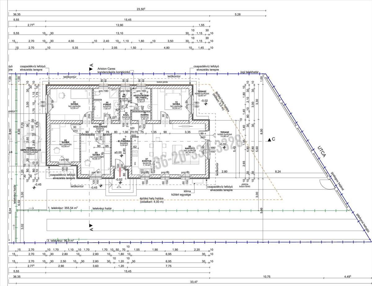 -amerikai konyhás nappali terasz kapcsolattal, kamra, 4 szoba, fürdőszoba, vendég wc, háztartási helyiség, előszoba-közlekedő.