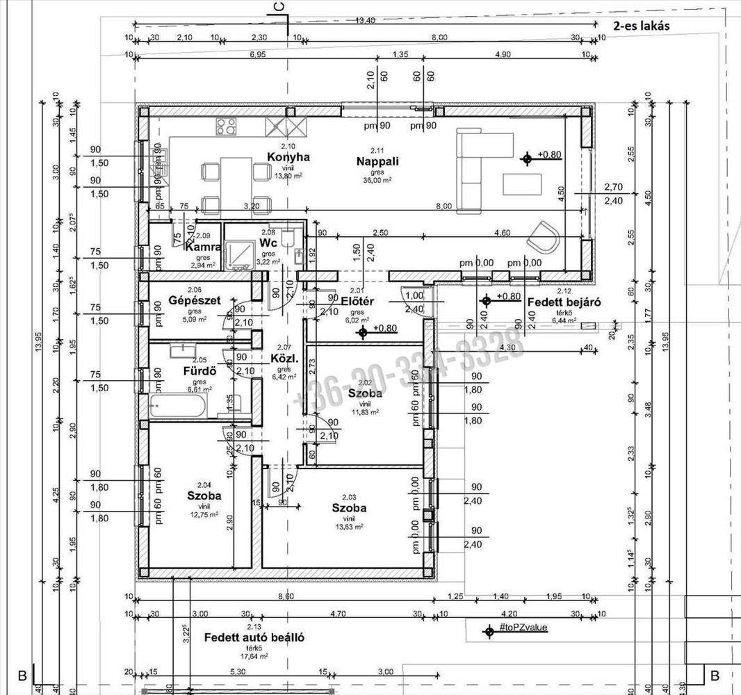 -amerikai konyhás nappali (36 nm) terasz kapcsolattal, 4 szoba (12, 13, 14, 14 nm), egy kádas fürdőszoba WC-vel, bidével, dupla mosdóval és a szülői hálóhoz kapcsolódó zuhanyzós fürdőszoba WC-vel, gépészeti helyiség, vendég wc, előtér-közlekedő.