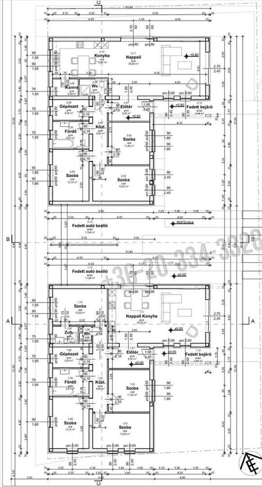 Az 1145 nm-es telekre két ház épül, melyek csak a fedett gépkocsi beállóknál érintkeznek, nincs közös FAL!