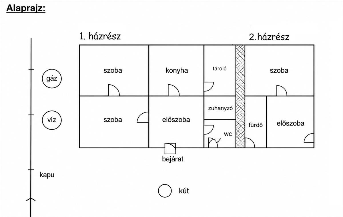 1. Lakrész: előszoba, konyha, kamra/tároló, 2 szoba, fürdő