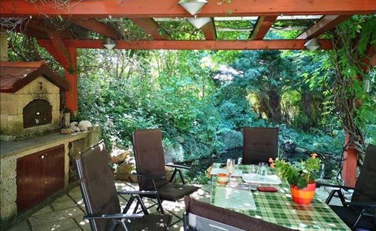 Négyszobás családi ház áll előtte és mellette fedett és nyitott terasszal, 30m2-es gazdagon benőtt pergolával, kerti dísztóval.