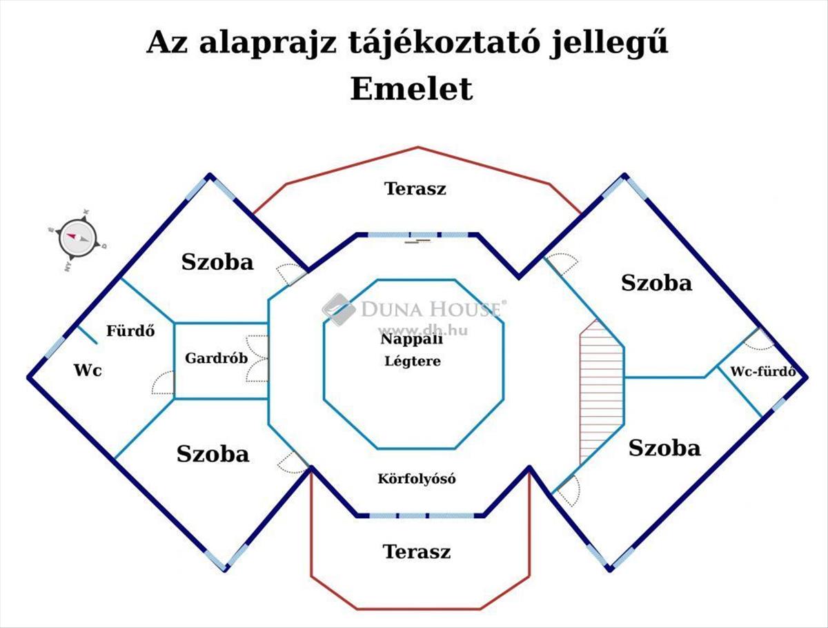 Emeleten négy hálószoba, gardrób és két fürdő WC-vel található. Hatalmas teraszok és a gondozott kert emeli a ház értékét. a közlekedés kiváló, 20 perc alatt elérhető Bp.