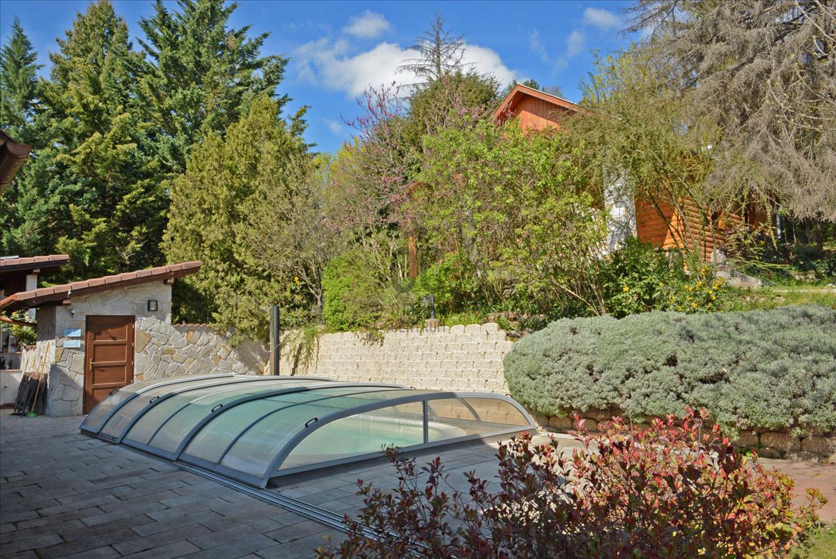 Az épület első emeletének szintjén a ház mögötti kertrészen van kialakítva az a csúsztatható boltíves polikarbonát tetővel ellátott kültéri medence, mely ellenáramoltatóval, fűtő berendezéssel és nagy teljesítményű vízforgató és homok alapú szűrőberendezéssel van ellátva. a medence melletti kültéri zuhanyzó alatt található a medence gépészeti egysége, míg a belépő vízrendszer központja a medence melletti tároló épületben helyezkedik el. a medence mellől indul az a széles lépcsősor, mely a fölötte lévő telekre vezet, mely ettől a szinttől egy támfallal különül el.