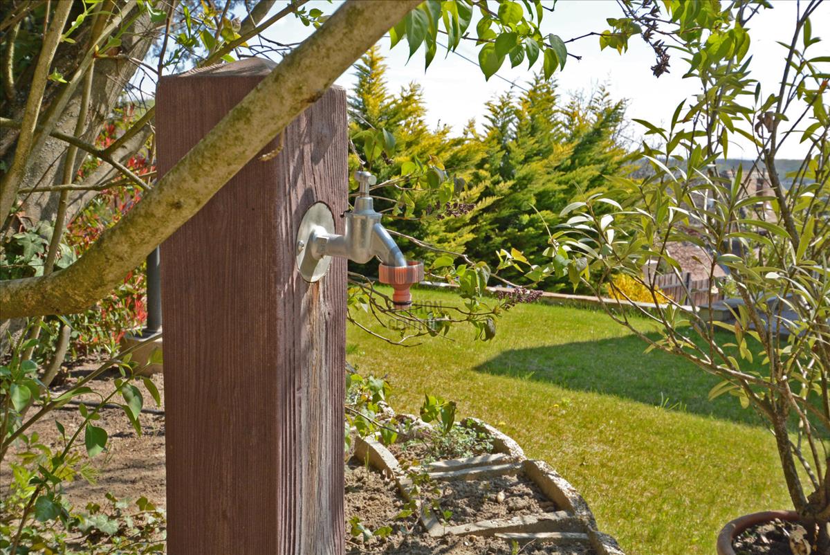 Az épület első emeletének szintjén a ház mögötti kertrészen van kialakítva az a csúsztatható boltíves polikarbonát tetővel ellátott kültéri medence, mely ellenáramoltatóval, fűtő berendezéssel és nagy teljesítményű vízforgató és homok alapú szűrőberendezéssel van ellátva. a medence melletti kültéri zuhanyzó alatt található a medence gépészeti egysége, míg a belépő vízrendszer központja a medence melletti tároló épületben helyezkedik el. a medence mellől indul az a széles lépcsősor, mely a fölötte lévő telekre vezet, mely ettől a szinttől egy támfallal különül el.