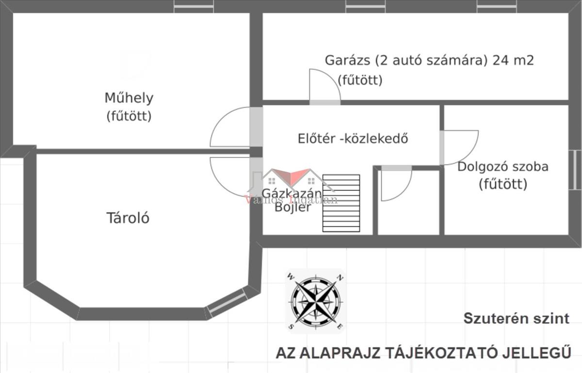 Kétállásos garázs szekcionált kapuval (távirányítással), műhely, tároló, iroda v. Szoba, valamint tusoló–WC–kézmosó. Itt kapott helyet egy Immergas gázkazán és 200 L bojler, mely biztosítja a fűtést és melegvizet az egész házban. Minden helyiségben radiátoros fűtés van, a tároló kivételével. a szuteréntől egészen a tetőtérig belső lépcső köti össze a három szintet, így a garázsból is száraz lábbal, kényelmesen juthatunk fel a lakótérbe – a ház minden szintje házon belül megközelíthető.